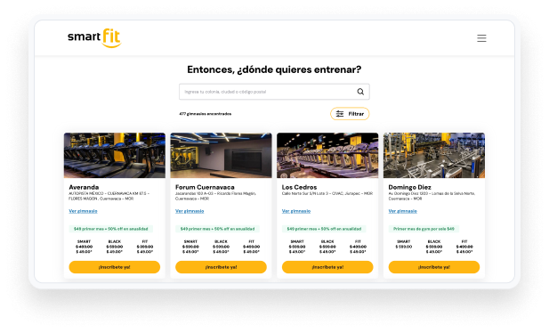 Smart Fit se ha consolidado como la cadena de gimnasios más grande de Latinoamérica y líder indiscutible en México, operando 420 sucursales en el país y más de 1800 en toda la región. Su modelo de negocio se basa en el principio de entregar un producto de gran calidad con precios accesibles.
