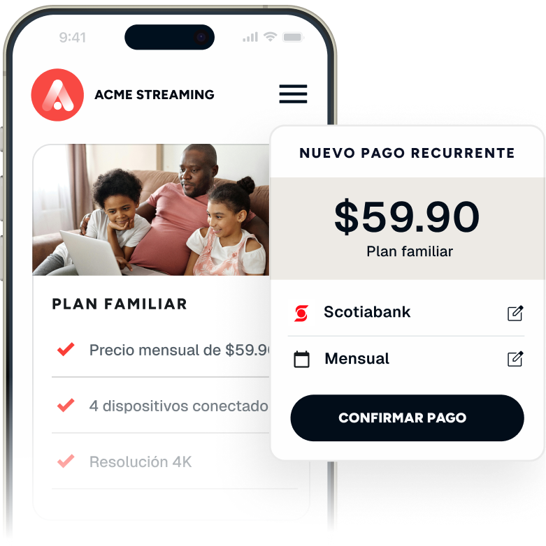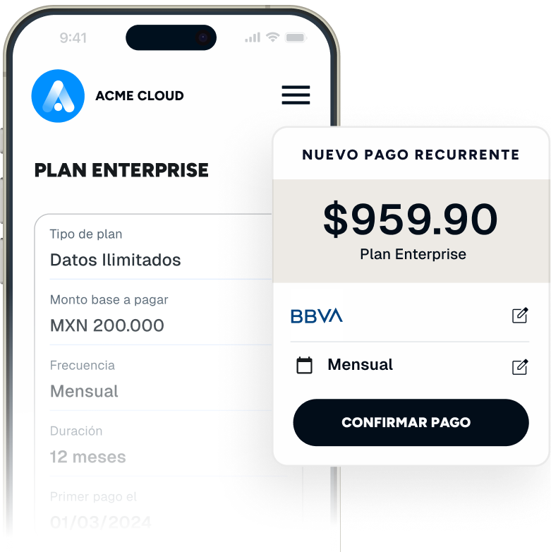 Verifica la identidad de tus clientes con un micro cobro en su cuenta bancaria y permite que programen sus pagos de forma fácil, sin salir de tu app o web.