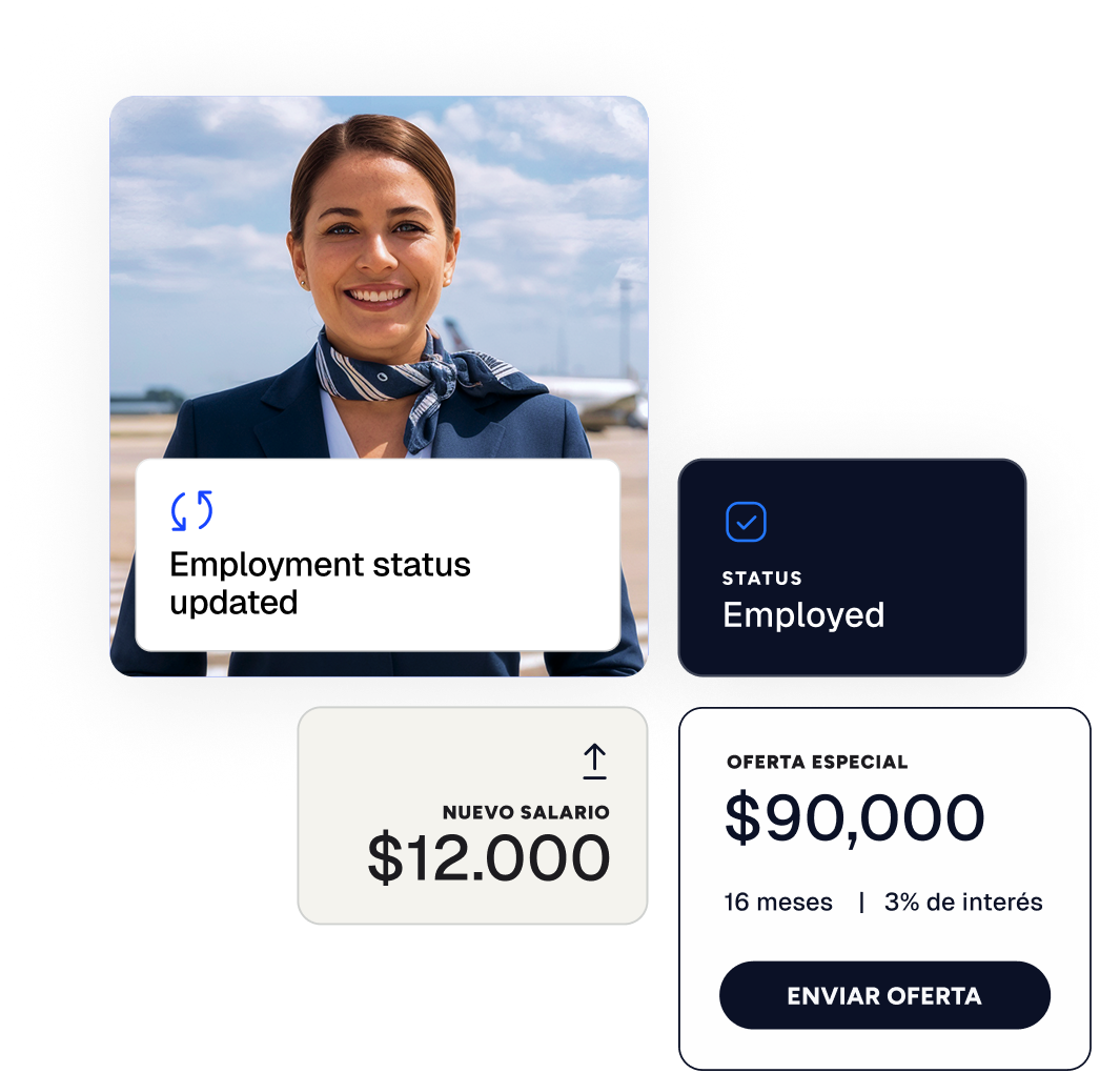 La vida laboral de tus clientes está en constante movimiento. Recibe alertas automáticas de cambios relevantes de empleo para diseñar ofertas de crédito más inteligentes.
