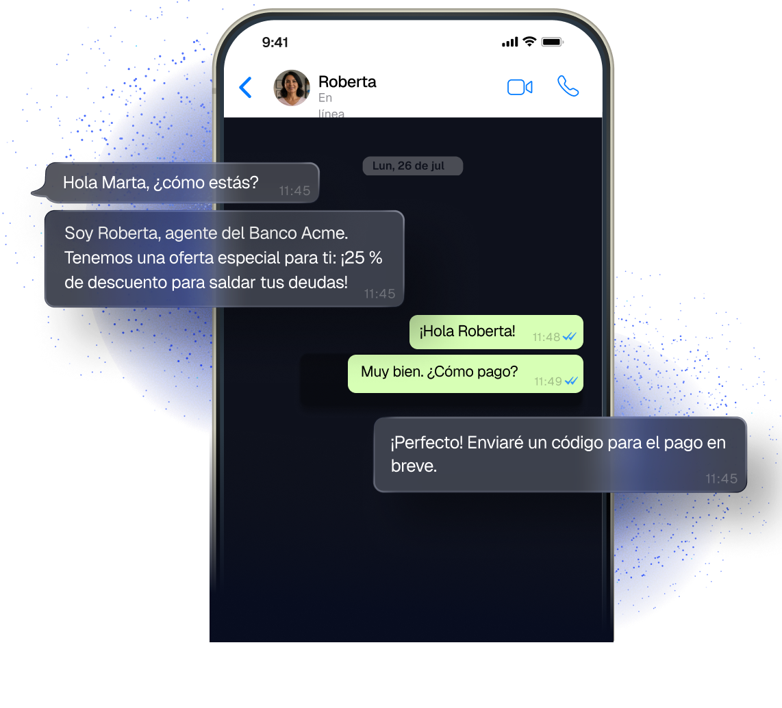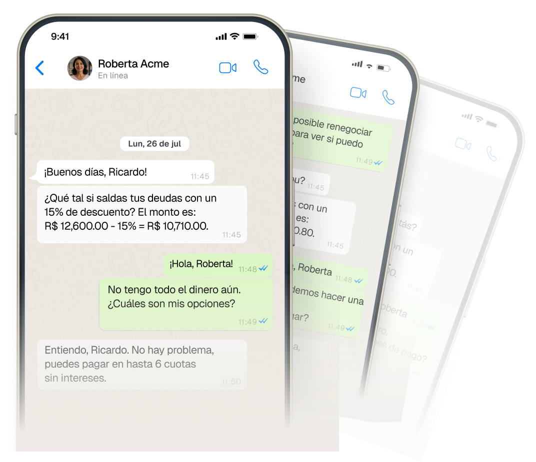 Nuestros agentes analizan el contexto del cliente, adaptan su tono de conversación y negocian por voz o WhatsApp. El resultado: una recuperación más eficiente sin comprometer la relación con el cliente.