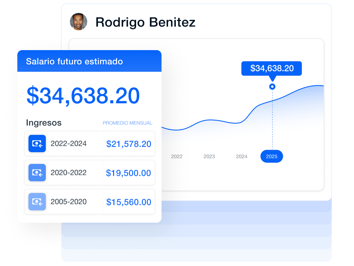 Los préstamos se pagan con ingresos futuros, no pasados. Accede a una estimación de ingresos confiable y a información clave sobre la trayectoria laboral de tus clientes para ofrecer créditos con mayor confianza.